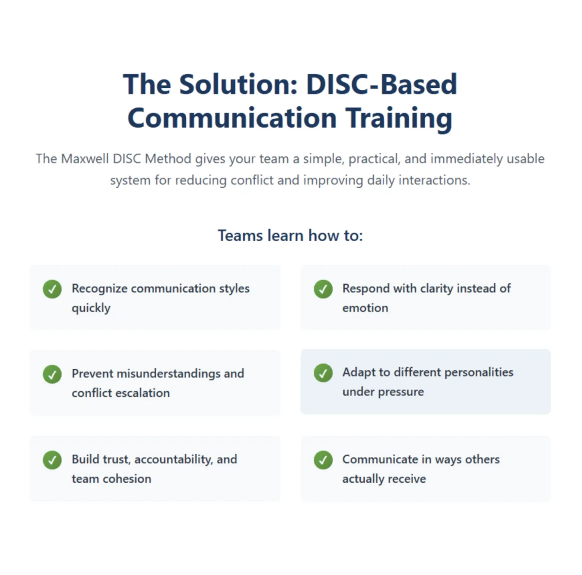 Most teams don’t struggle because they lack talent or motivation. They struggle because they don’t understand each other. When communication styles clash, even simple conversations can turn into tension, frustration, and avoidable conflict. Misunderstandings build, trust erodes, and small communication gaps become big problems. Conflict doesn’t stay contained. It affects morale, productivity, relationships, and results. DISC stops it before it starts.